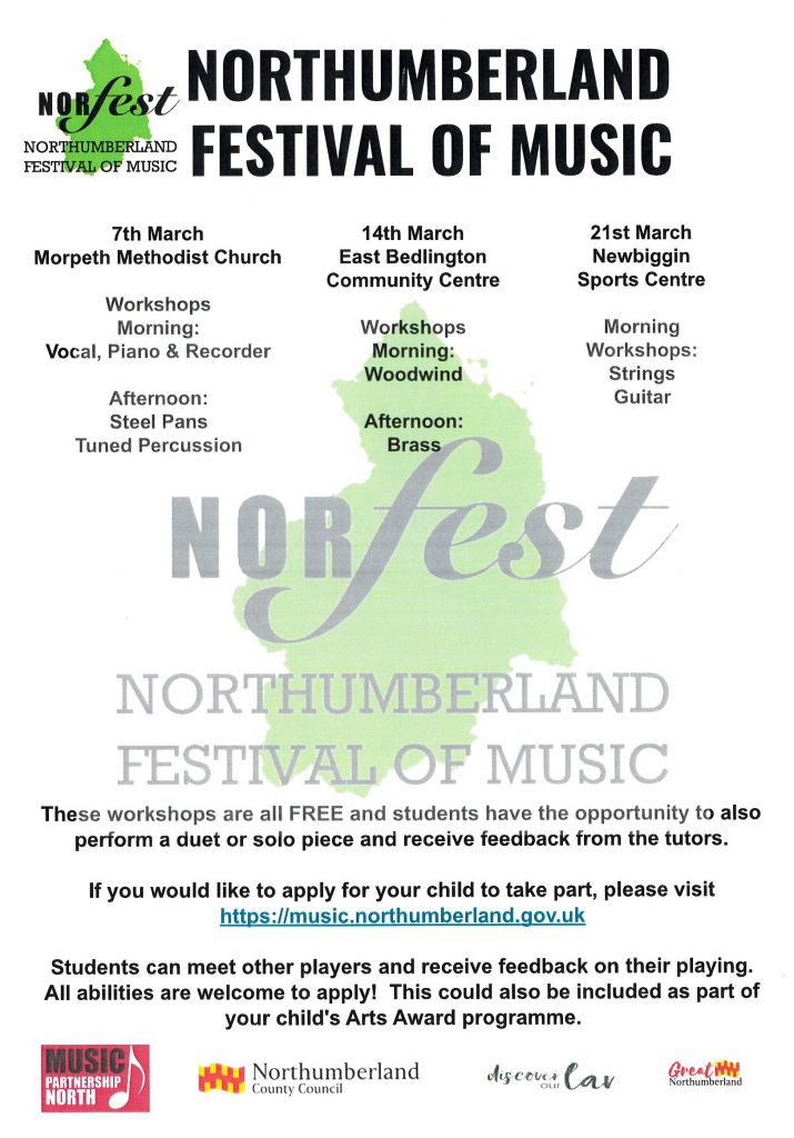 A number of workshops for various instruments as part of Northumberland Music Festival will be taking place this year, these workshops are all FREE and students have the opportunity to also perform a duet or solo piece and receive feedback from the tutors. If you would like to apply for your child to take part, please complete the following application form.