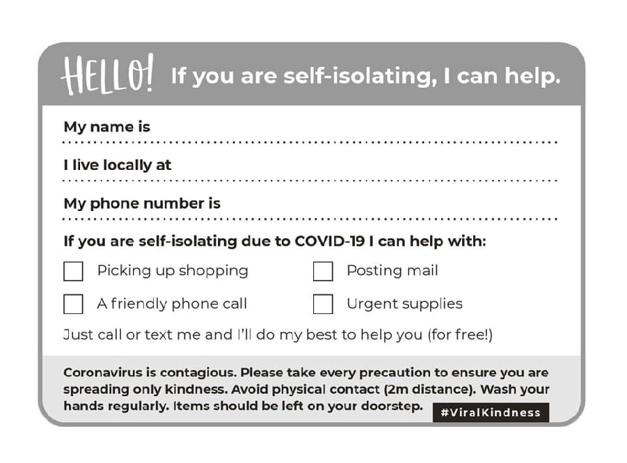 You can use a format similar to that shown below, available to download via the following link Self Isolating Help Postcard or collect them from Newbiggin Co-op and McColls from tomorrow. Other venues for distribution are being looked into.