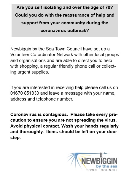 In an attempt to identify those who are vulnerable in our community, the following flyer will be in the school children’s back packs/folders – we thank The Northumberland Church of England Academy for co-operating with us on this. Please give the flyer to grandparents/great grandparents/elderly neighbours. An attempt is also being made to deliver these to all bungalows/cottages within our parish over the next few days.