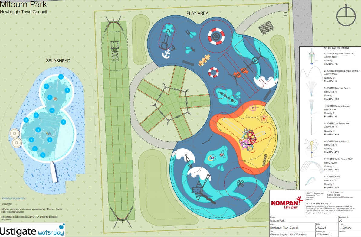 The Town Council is proposing the development of £250,000 new play facility at Milburn Park. We already have £100,000 committed in our current budget and intend to request match funding and grants to hit our funding target. The development of the new play area will see the existing play area at Spital Burn being removed and a new destination play area developed on the land next to the Bowls Green as shown in the location plan below.