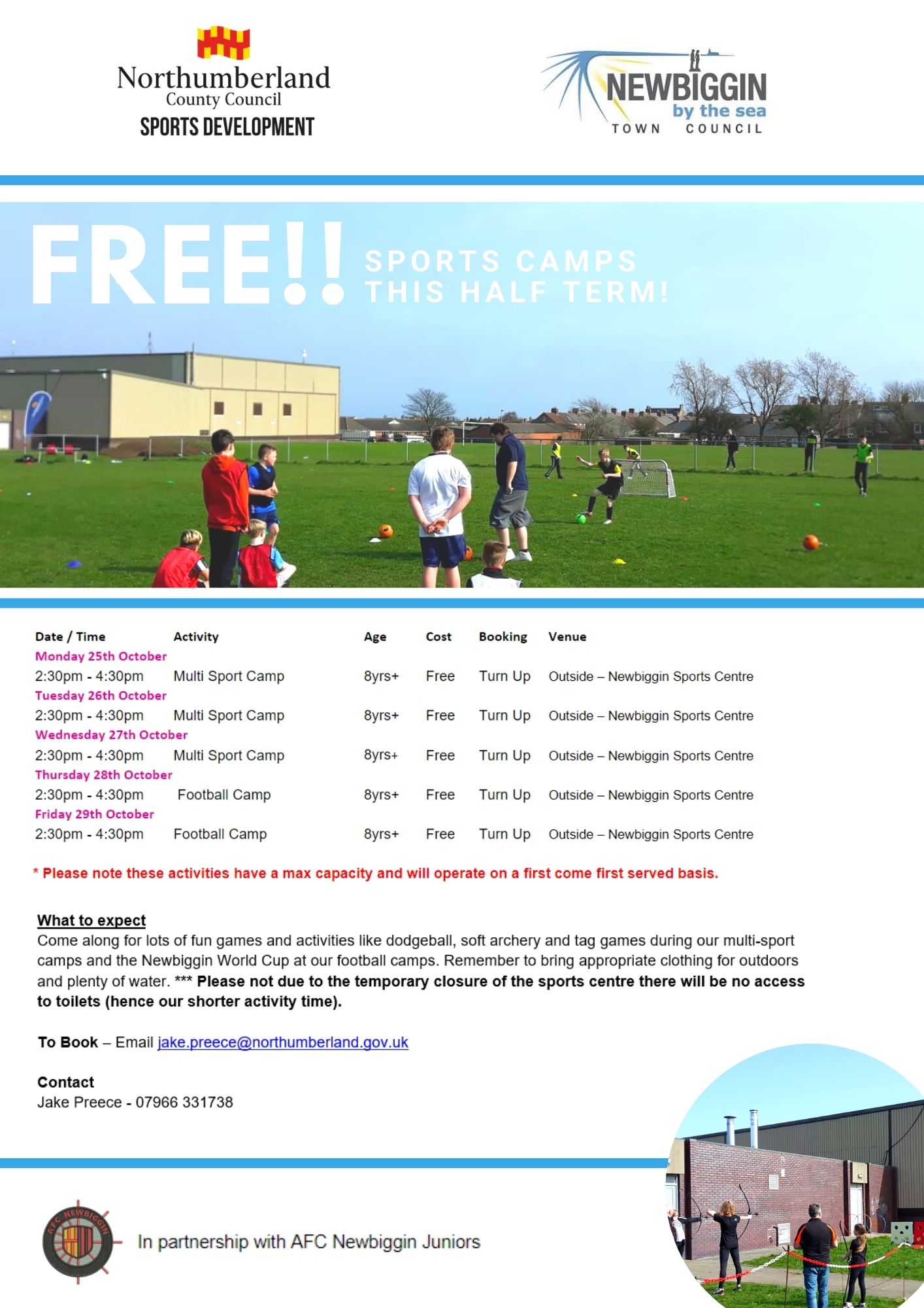 The FREE activities which will be held outside Newbiggin Sports and Community Centre during the October half term are detailed below. Please note that activities have a maximum capacity and spaces will be allocated on a first come first serve basis.