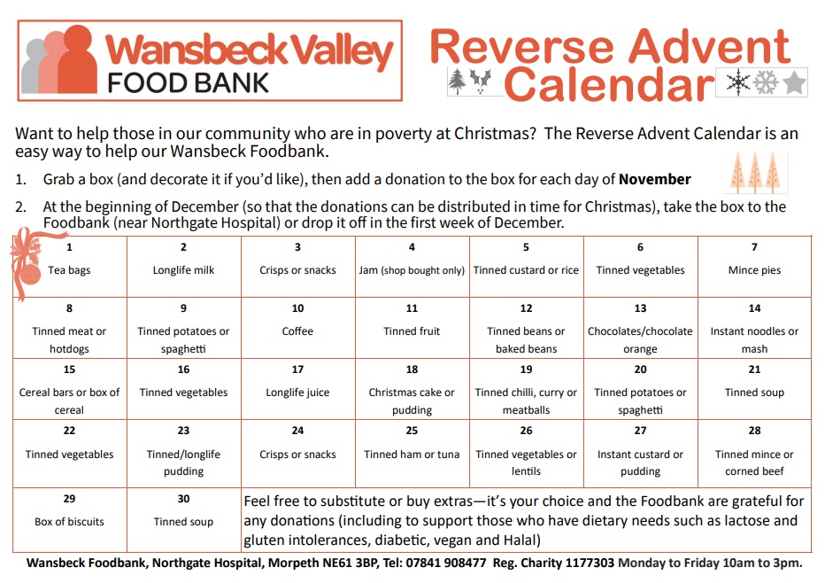The Town Council Office will act as a collection point for Reverse Advent Calendars for any residents who are unable to travel to the Foodbank between the 1st and 7th December.