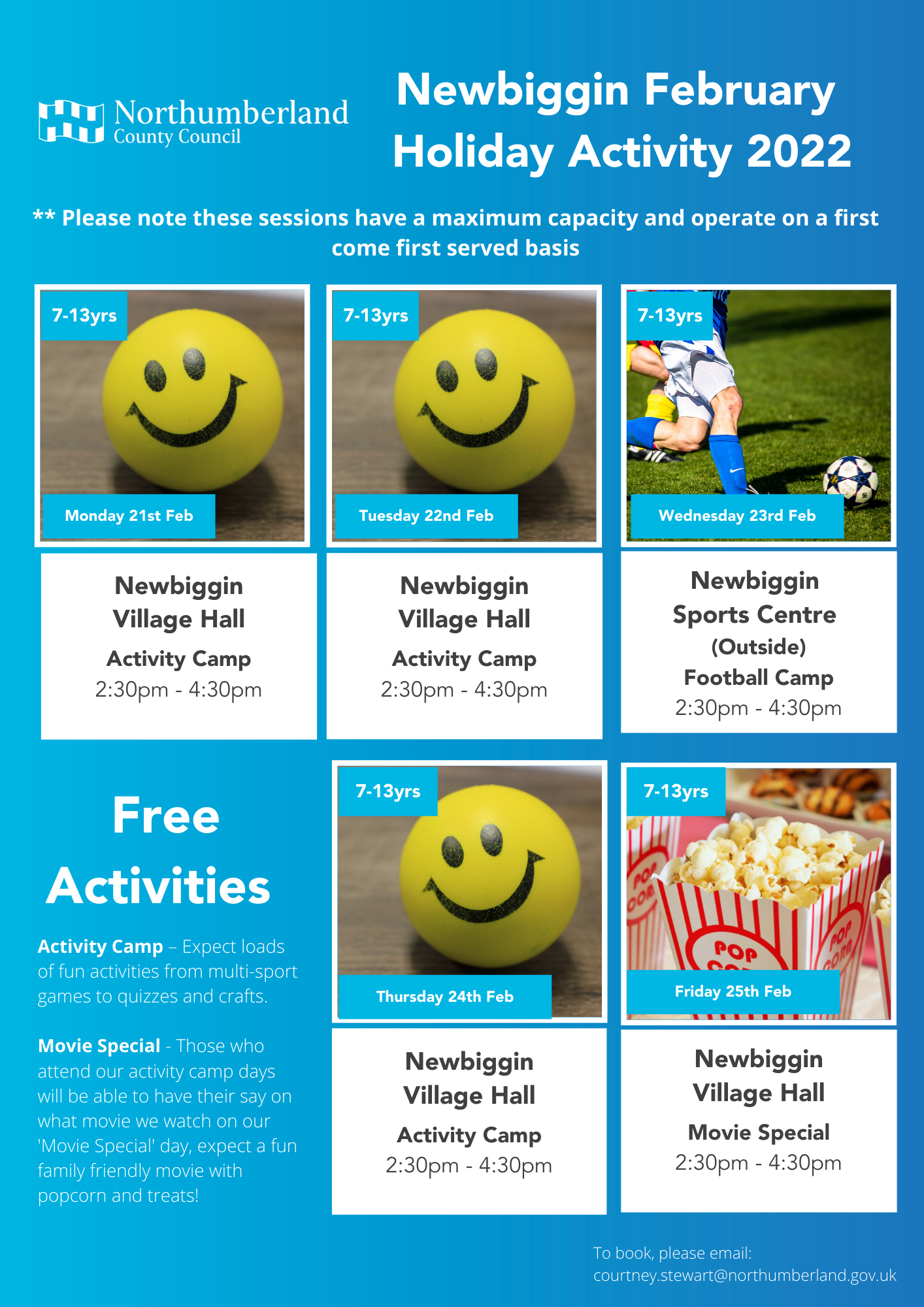Activities will be held at Newbiggin WI Hall on Long Park and include some brand new activities and a movie special, and the outdoor Football camp will be held outside the Sports Centre held at Newbiggin Sports and Community Centre.