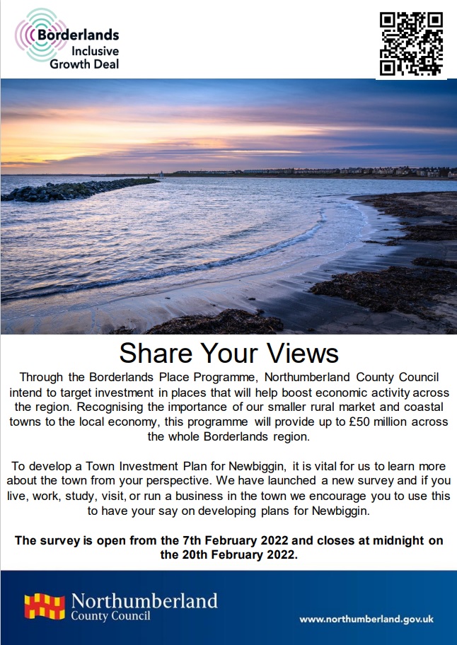 Do you live, work, study, visit or run a business in Newbiggin by the Sea? If so, have you’re chance to contribute to the developing Town Investment Plan for Newbiggin. Complete the below survey between 7th February and 20th February via the online link or pick up and return a hard copy of the survey from the Town Council office.