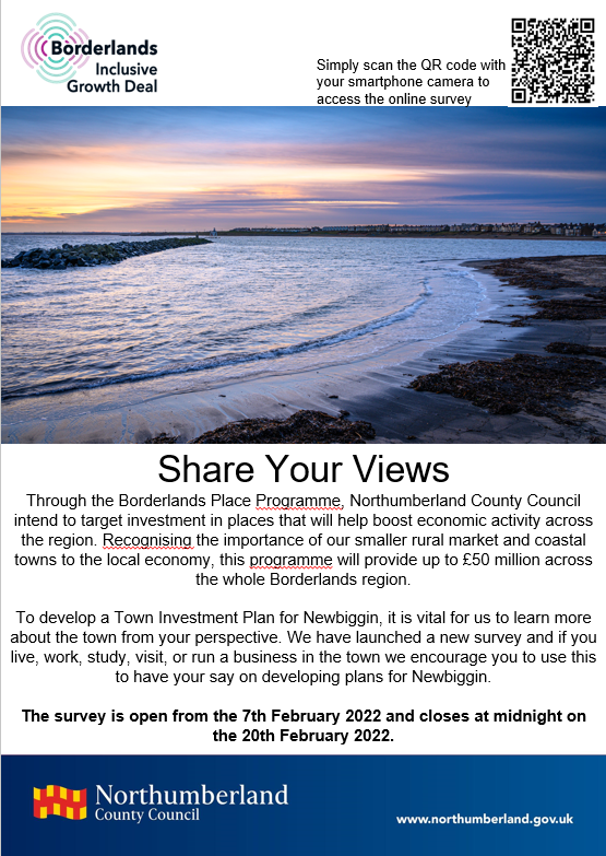 Do you live, work, study, visit or run a business in Newbiggin by the Sea? If so, have you’re chance to contribute to the developing Town Investment Plan for Newbiggin. Complete the below survey between 7th February and 20th February via the online link or pick up and return a hard copy of the survey from the Town Council office.