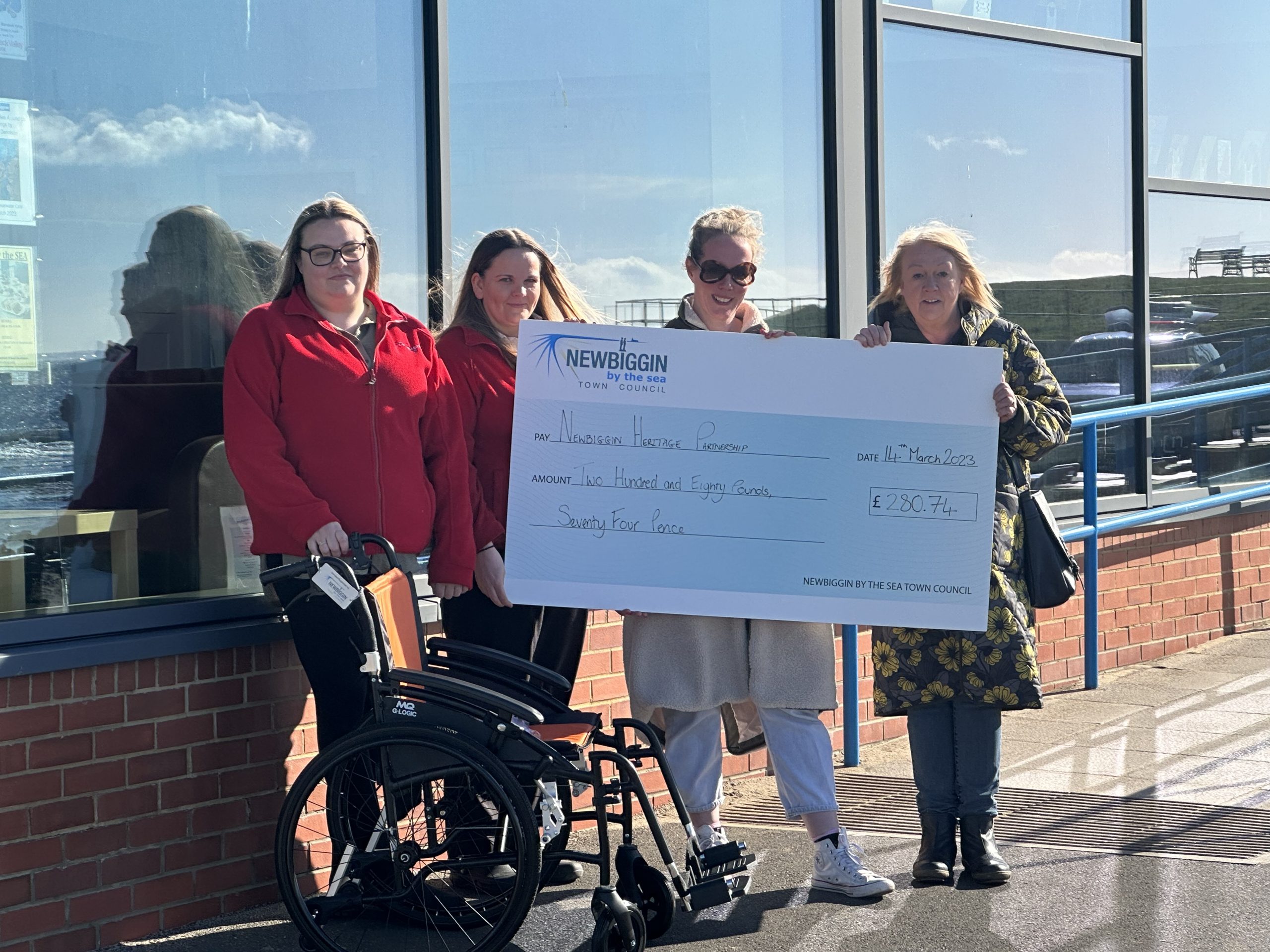 On the morning of Tuesday 14th March, Councillor Alison Sutherland, Deputy Mayor of Newbiggin By The Sea, accompanied by Councillor Ami Wootton, visited Emma and Shannon at Newbiggin Maritime Centre to present Newbiggin Heritage Partnership with a donation of £280.74 to pay for a new defibrillator battery and pads.  Newbiggin Town Council also presented them with a new emergency wheelchair.