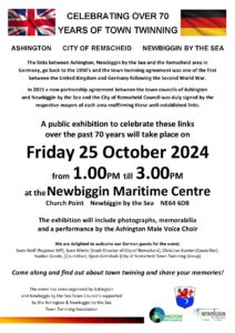 The exhibition has been organised by Ashington and Newbiggin by the Sea Town Council’s, supported by the Ashington & Newbiggin by the Sea Town Twinning Association and everyone is welcome to attend. The Town Twinning Association has been developed by local people to encourage participation in town twinning and provide practical support in developing and organising exchange visits between the areas.