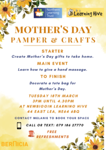Join Newbiggin Learning Hive for an afternoon of pampering and creativity. Unleash your artistic side as you craft beautiful gifts to take home for that special mum in your life.