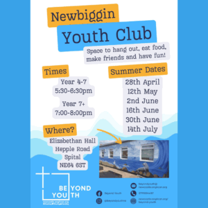 Newbiggin Youth Club SAVE THE DATES!Newbiggin Youth Club returns fortnightly! Whether you’re looking to chill out, grab some snacks, meet new people, or just have a great time – Beyond Youth have got you covered at Elizabethan Hall!For more info please see poster.SHARE THIS Previous postNext postComments are closed.