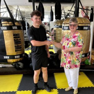 Photo – Cllr Fiona Rowley, Mayor of Newbiggin-by-the-Sea, who recently met with Lewis at Newbiggin Boxing Club to present him with his well-deserved cheque.