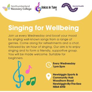 Join Northumberland Recovery College in partnership with Voices in Tune for a Singing for Wellbeing session at the Newbiggin Sports & Community Hub!