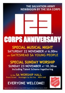 Newbiggin Salvation Army are thrilled to invite you to a weekend full of music and worship, celebrating 123 Corps Anniversary at the SA Worship Hall, Front Street, Newbiggin by the Sea, NE64 6AR.
