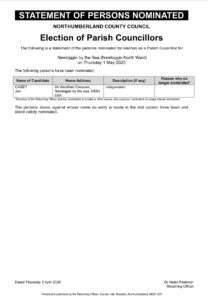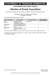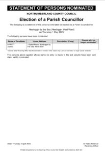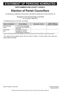 Northumberland’s Returning Officer has published the Statement of Persons Nominated – see Nominations below. There are 7 nominations for 8 vacancies, therefore the candidates were duly elected without contest. They are also displayed in our notice board on the side of the Town Council office building.