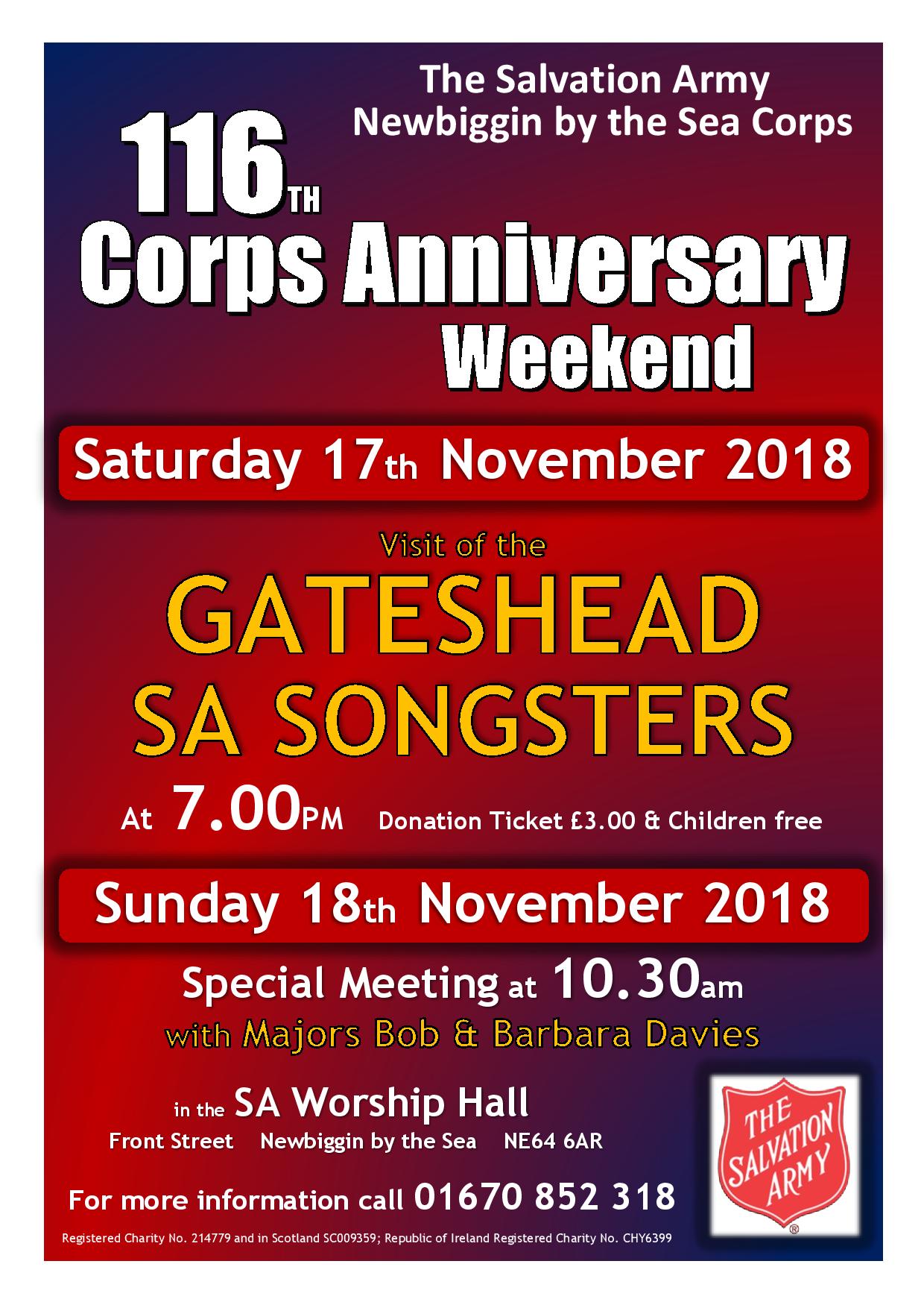 The Salvation Army Newbiggin by the Sea Corps presents the 116th Corps Anniversary Weekend on Saturday 17th November 2018.