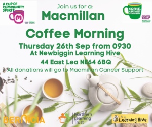 Join Newbiggin Learning Hive this Thursday at 9:30 AM for a Macmillan Coffee Morning!