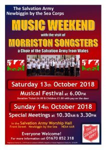 The Salvation Army Newbiggin by the Sea Corps presents a Music Weekend with the visit of Morriston Songsters , a Choir of the Salvation Army from Wales.