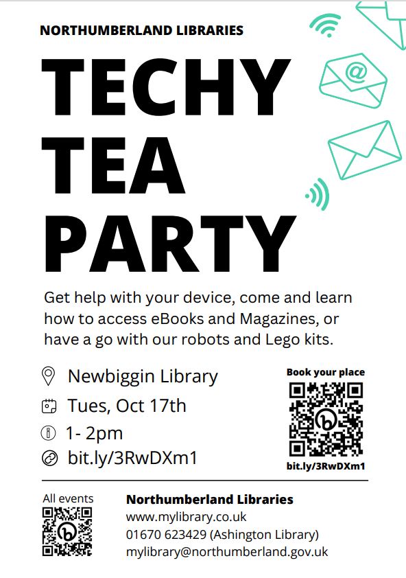Book your place at the Techy Tea Party at Newbiggin Library on the details above