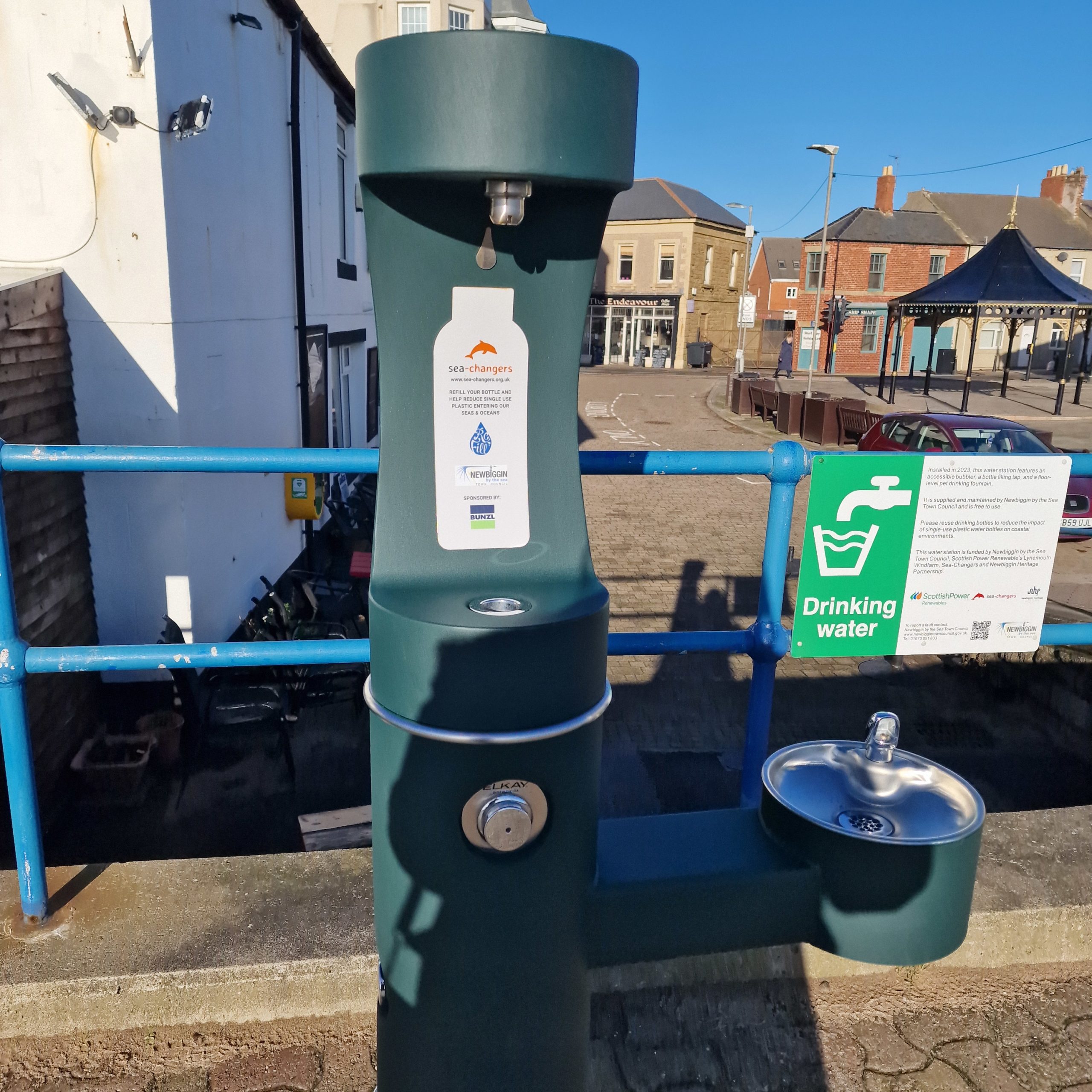 Newbiggin by the Sea was one of six coastal communities in the UK to be successful in securing a grant from Sea Changer's Coastal Fountain Fund in 2023. The purpose of the fund is to reduce the impact of single-use plastic water bottles on coastal habitats by funding communities to purchase water drinking fountains and install them for use by the public in busy or environmentally important areas.